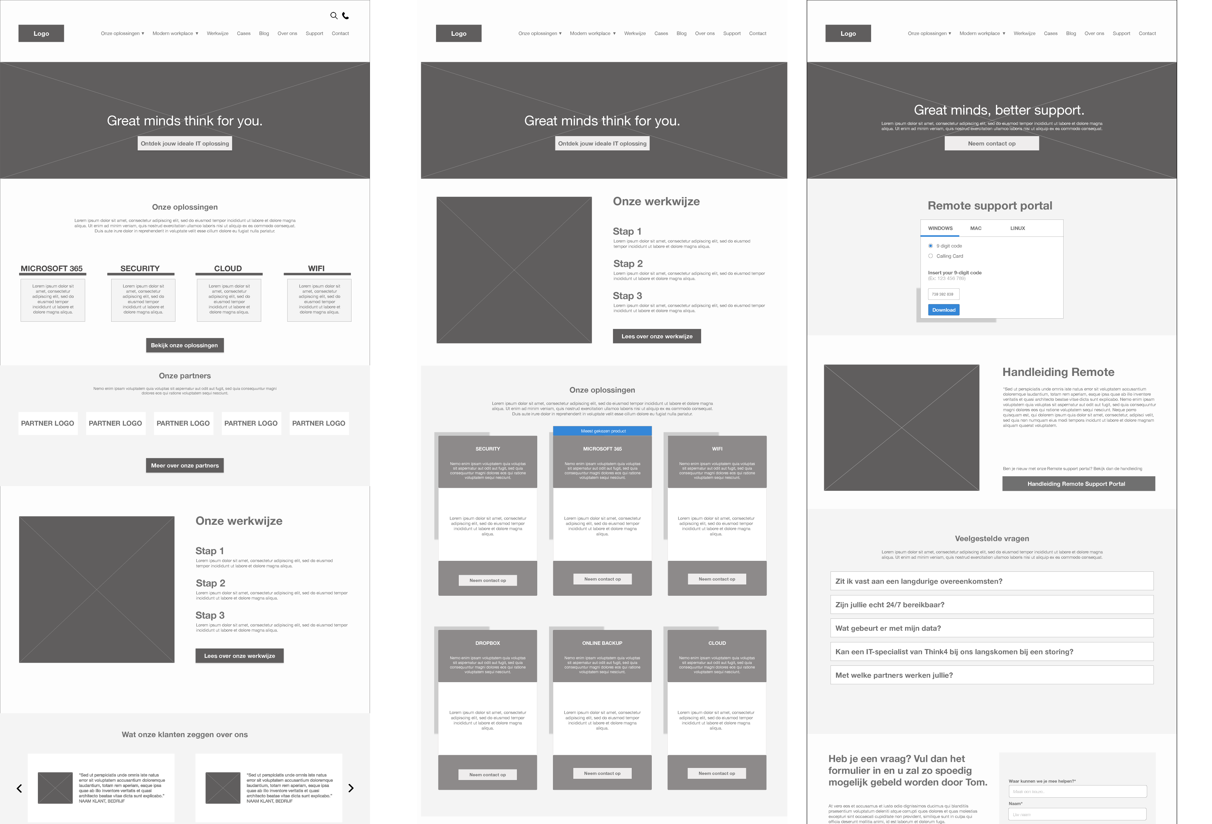 After my brainstorm sessions, I presented my concepts to five (potential) clients of Think4 individually. These were the same participants from my target audience research. I asked each particiapnt which concept they liked most and why. A few liked a mixed concept between concept 1 and 2, but the concept that was chosen the most was concept 1 Support. They find it extremely important to show the support side of the company more, because of the 24/7 helpdesk. It’s what the clients really love about the company, the fact they can be helped anywhere and anytime.