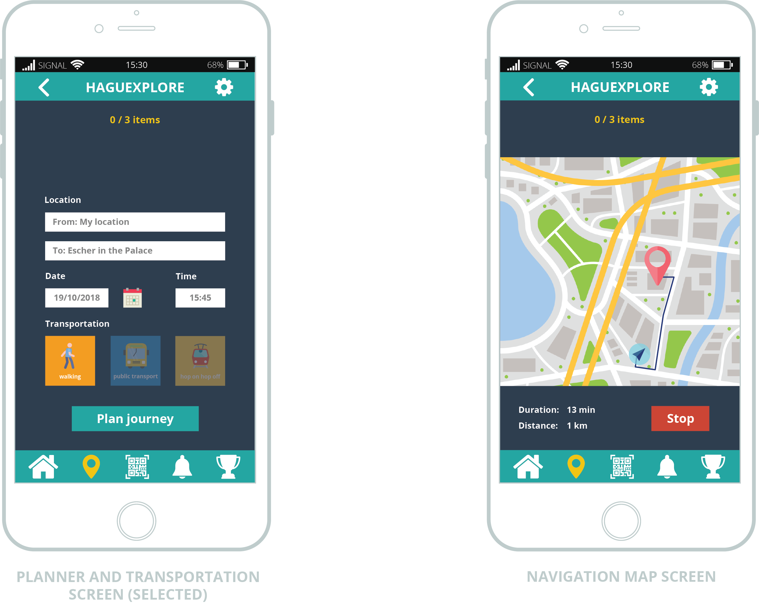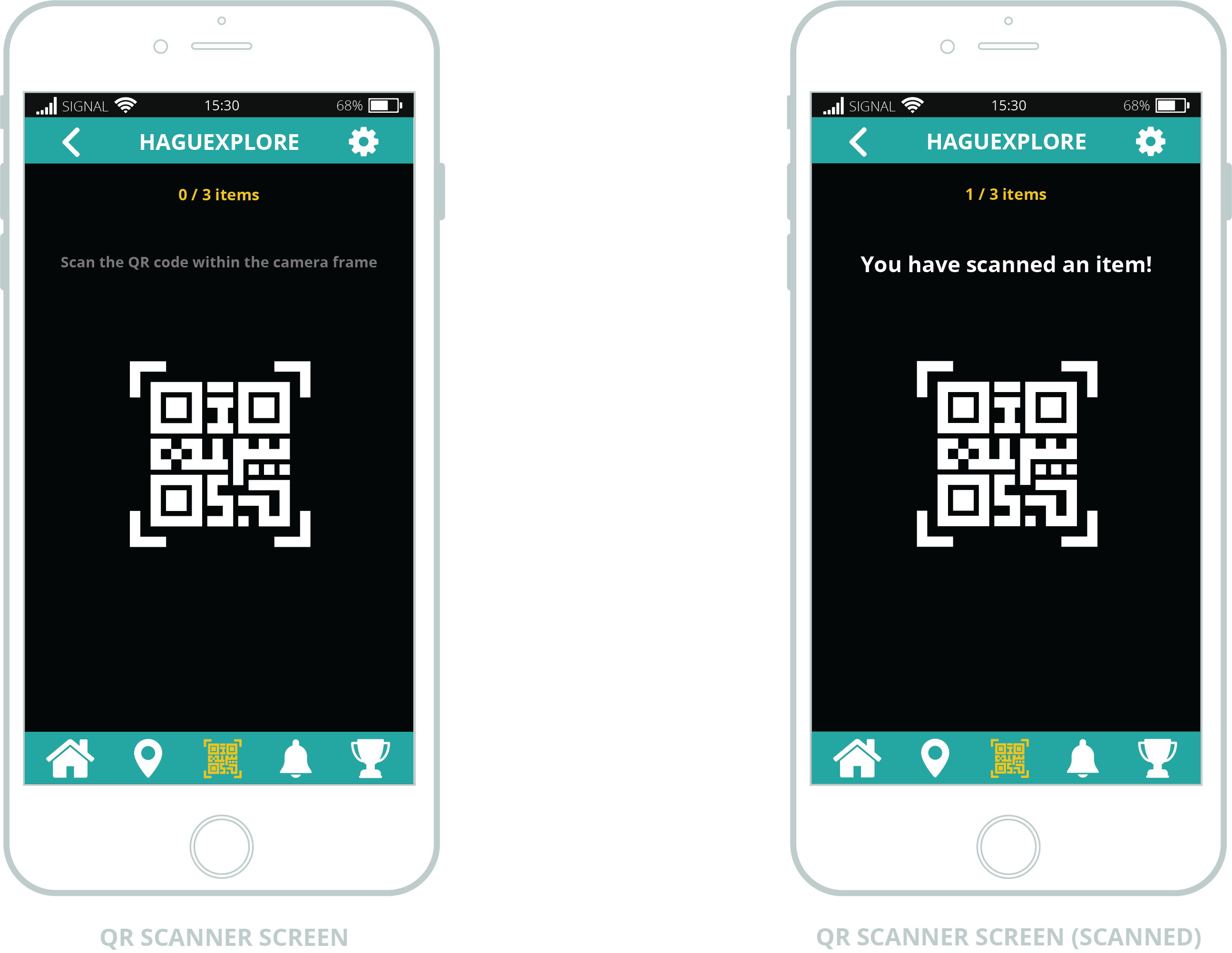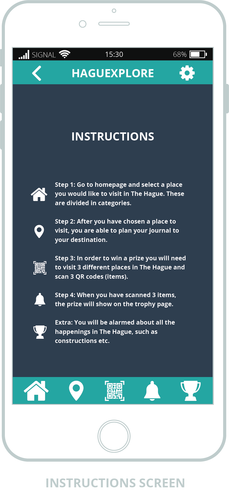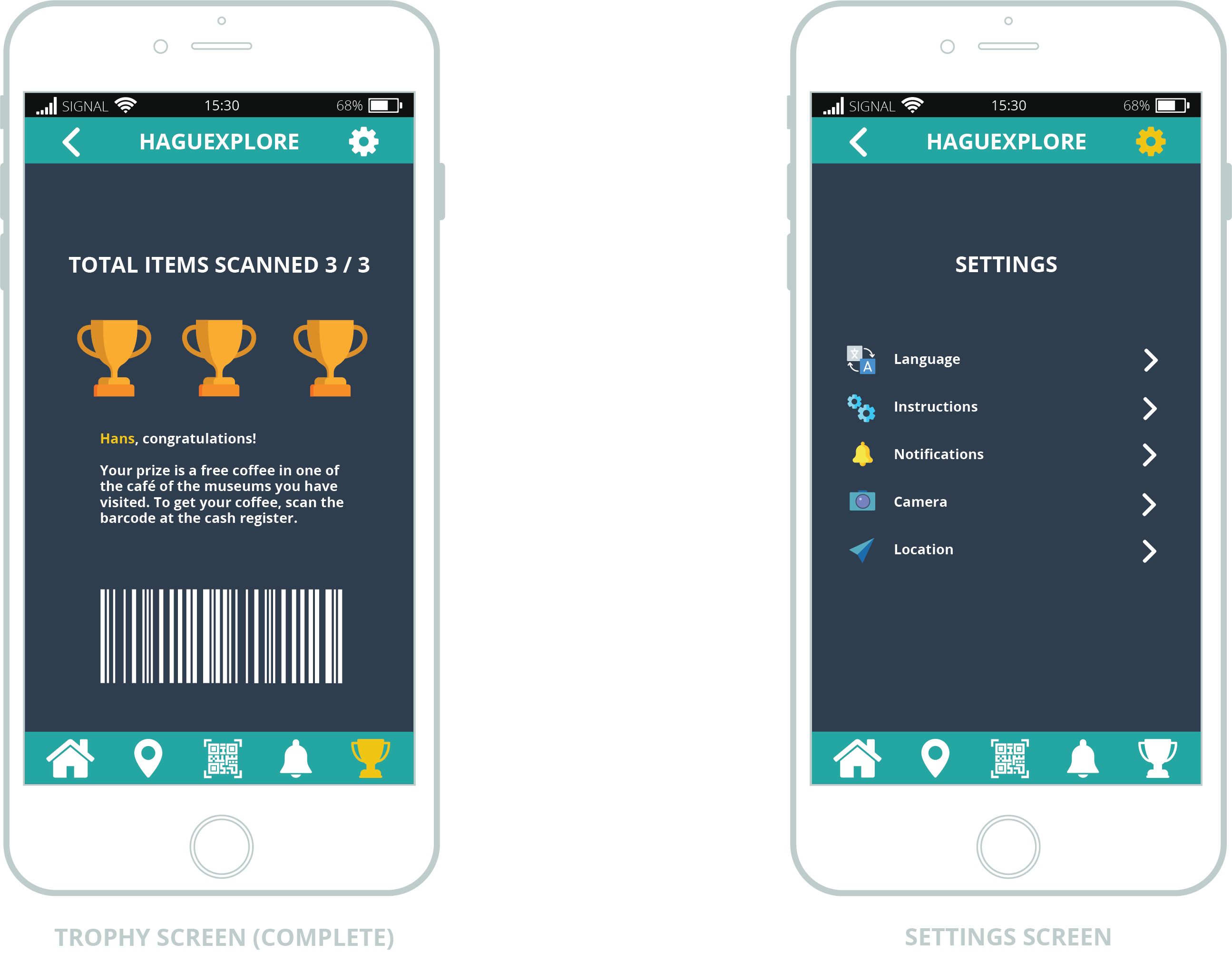 Trophy screen: When the user has collected all the items, the prize will be visible to the user. The user can use the bar code to get a free cup of coffee in one of the café’s of the places he has visited.