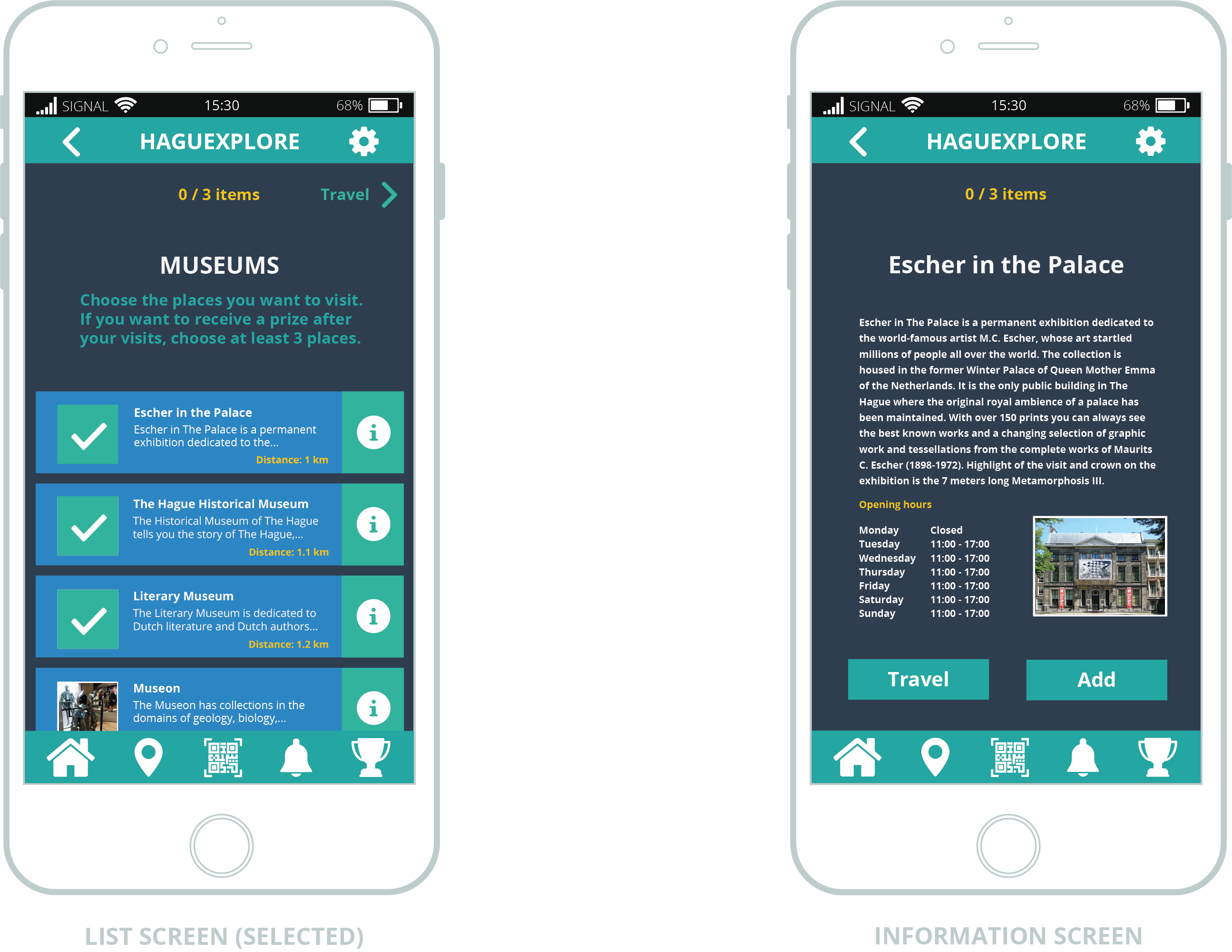 List screen: When the user chooses, for example the category museums, the user will then see a list with museums. This page will allow the user to choose a museum in The Hague. The results are based on the current location. The first museum is the nearest museum to the user’s current location. By tapping the information icon of one of the museum, the user will get to see more information about that museum.