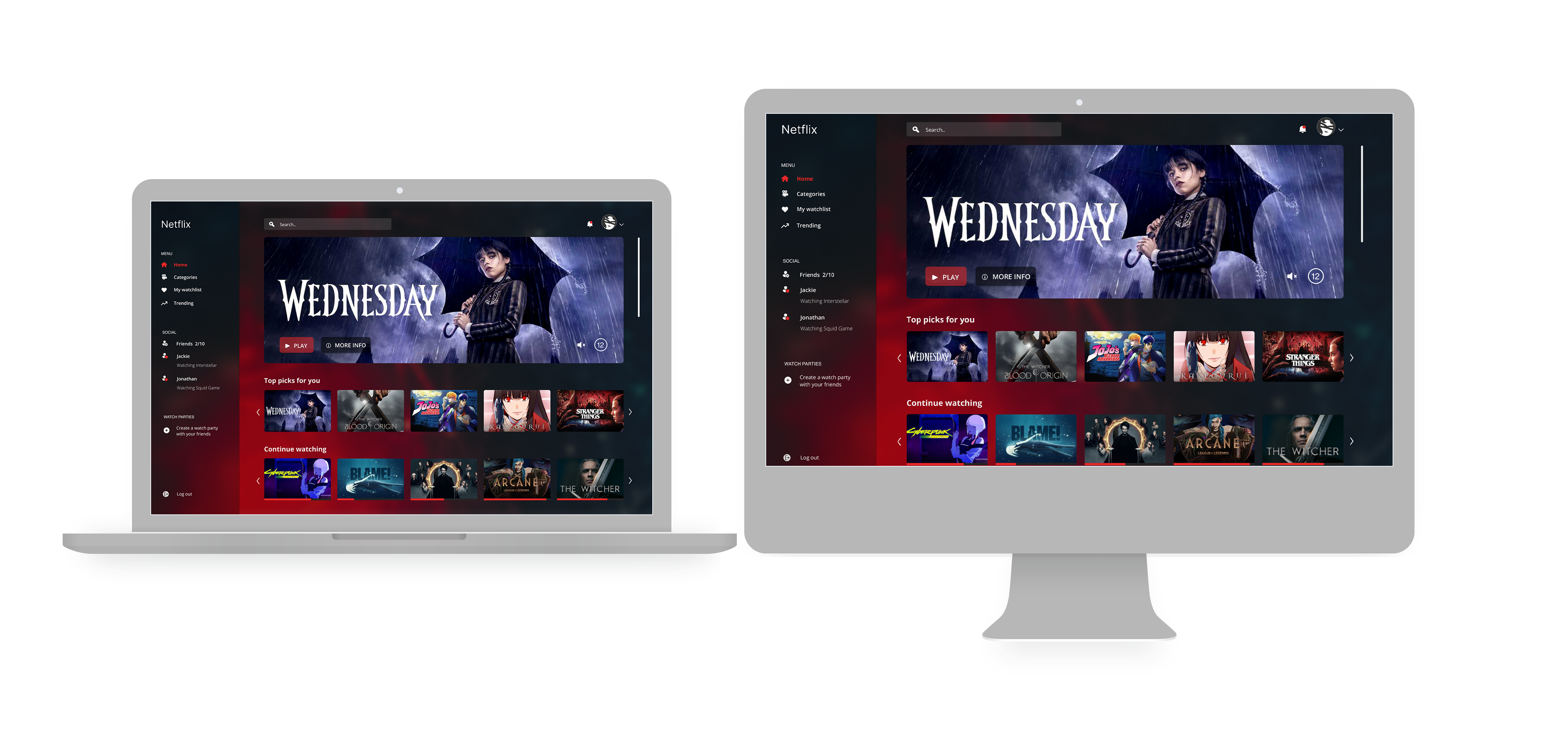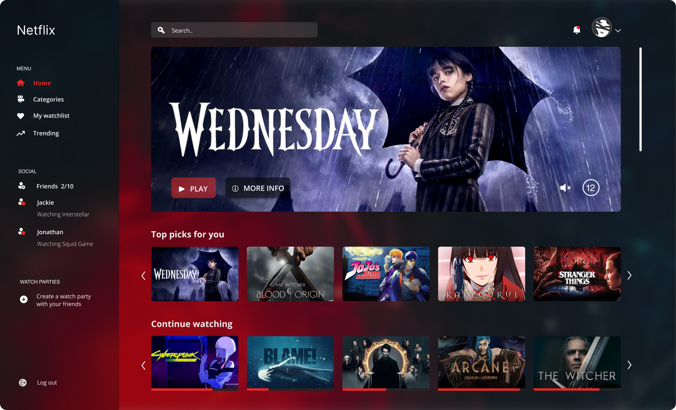 For this design, I wanted the app to have a clear overview of all the important elements of Netflix while keeping it clean and minimalistic. Aside from the list of movies and series, I focused on the social factors too, so that users feel connected with their friends. This concept design shows what the user’s friends are currently watching. They’re also able to create a watch party with friends in the fastest way.