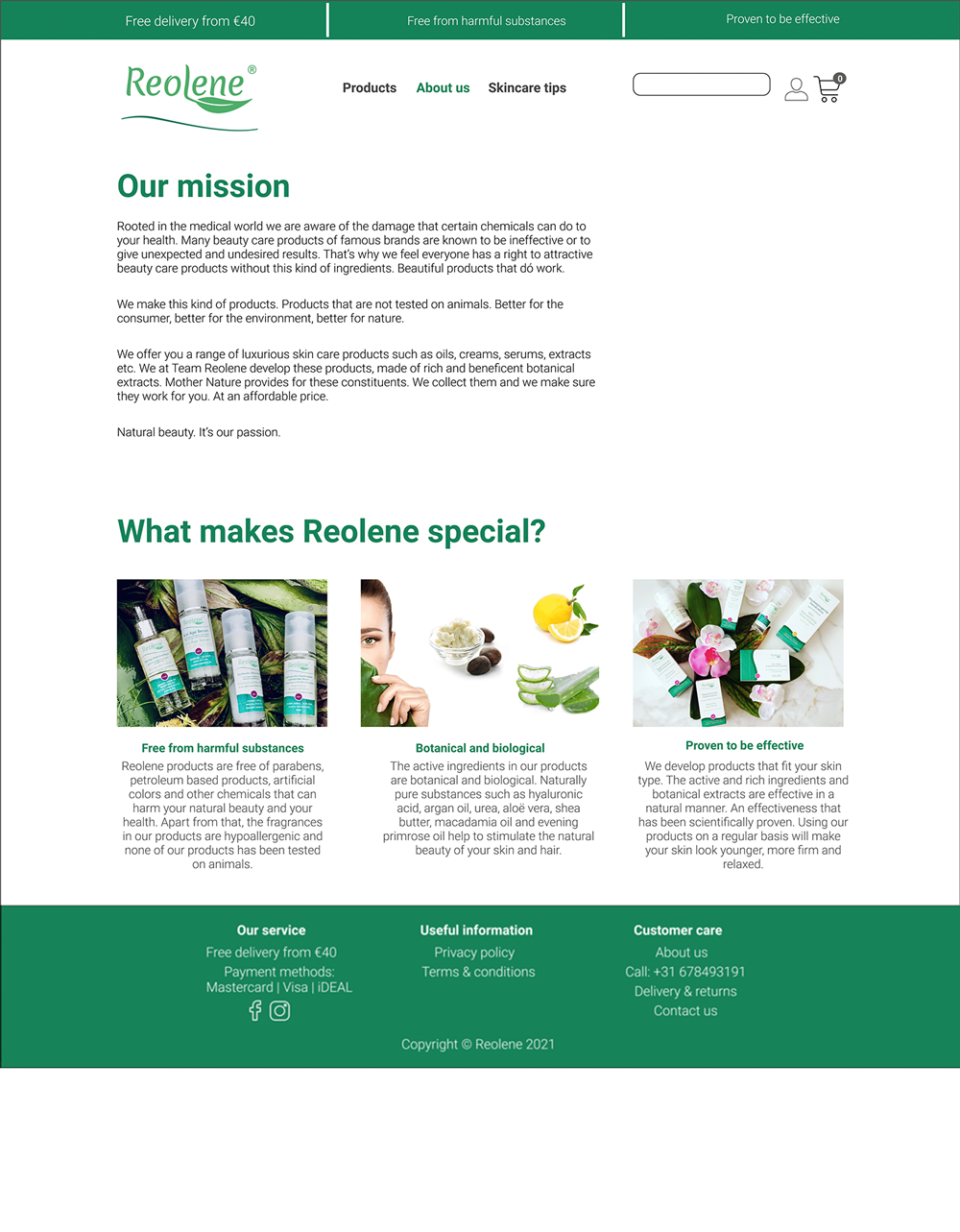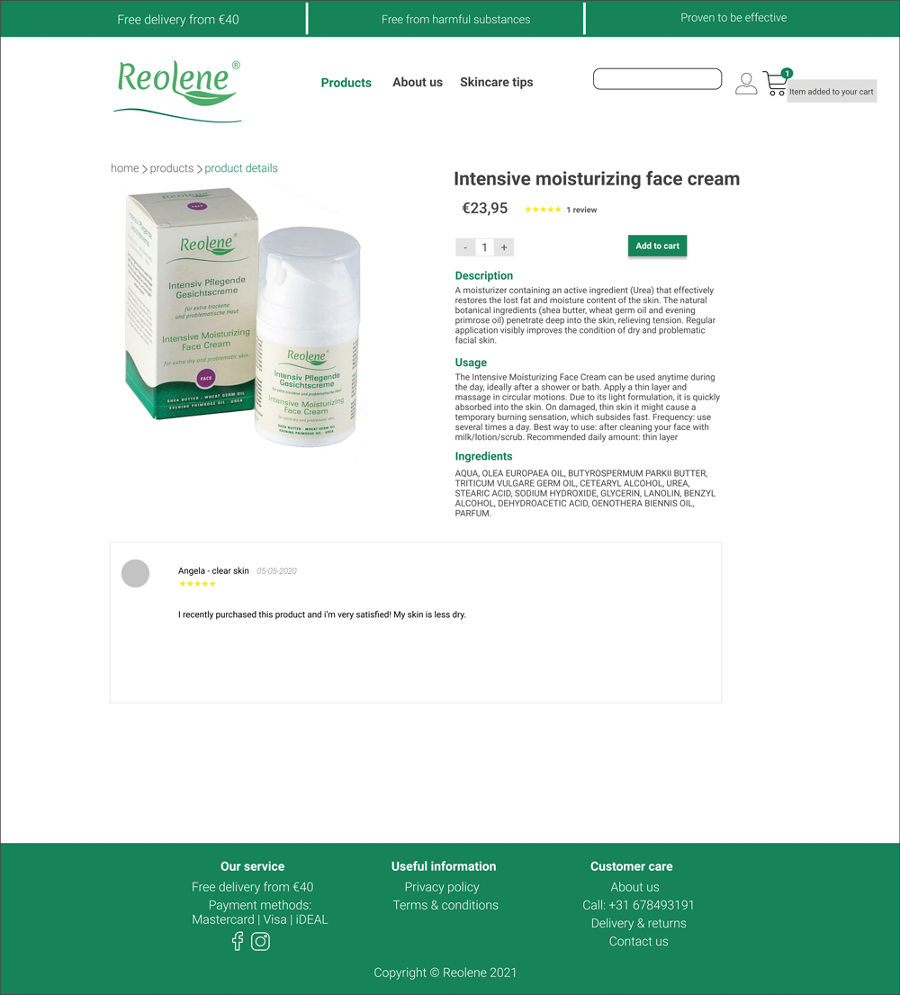 Reolene is a skincare brand and therefore it is extremely important to use correct words, visuals and images to connect with their (potential) customers. Skincare is a sensitive subject to many, because the given information on the webshop should feel reliable to customers, especially if they have never heard of the brand before.