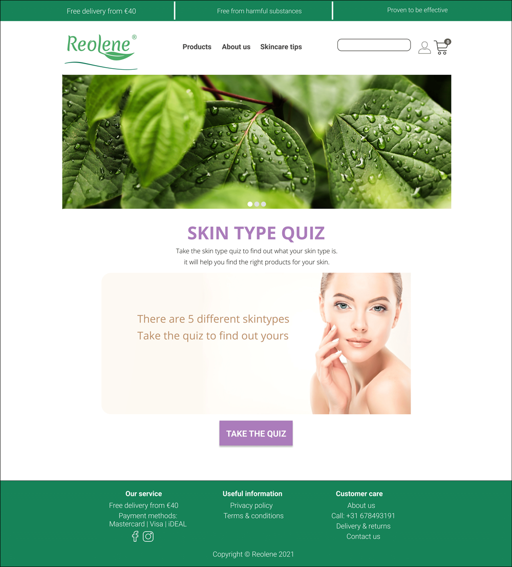 I’ve made the following decisions for the homepage. I decided to make use of a header that contains Reolene’s unique selling points: free delivery from €40, free from harmful substances and proven to be effective. I have also decided to put a slider on the homepage that can be used to bring awareness on topics like eco-friendly lifestyle, newest products, natural ingredients and more (Screen 1).