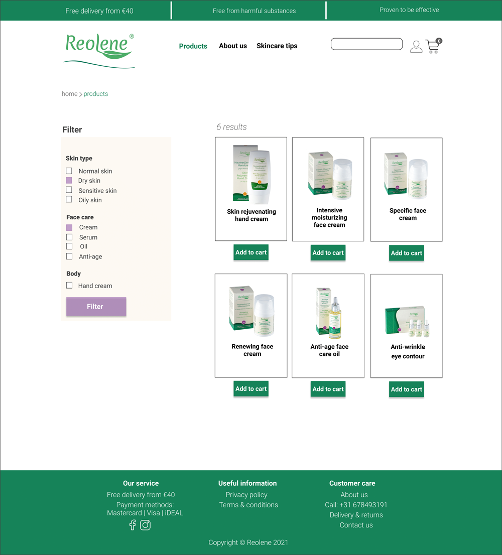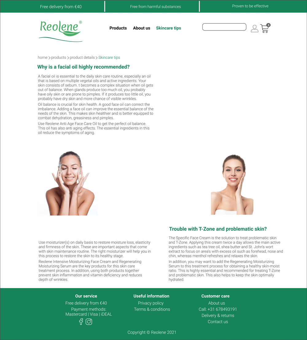 Since Reolene also offers free skincare tips to their customers on their webshop, I decided to create a separate page for this type of content, because this way it can be viewed as a blog (Screen 7).